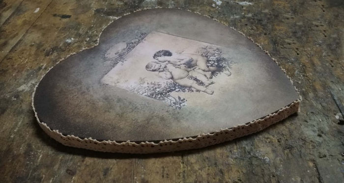 Bewerking met Powerprint, afbeeldingen naar keuze, beschilderen met Powertex en acrylverf.
